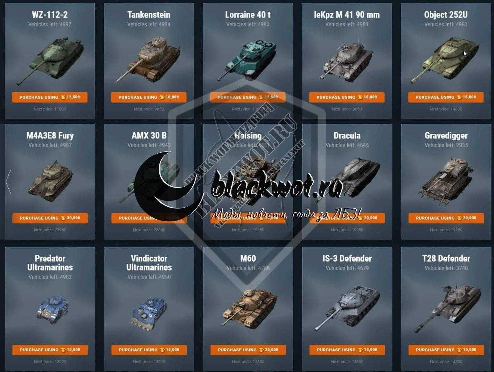 Эти танки были выставлены на аукцион в прошлом году (с их начальными ценами ) в ограниченном количестве. Люди со всех серверов могут купить эти танки на сайте wargaming, но только несколько танков были распроданы.