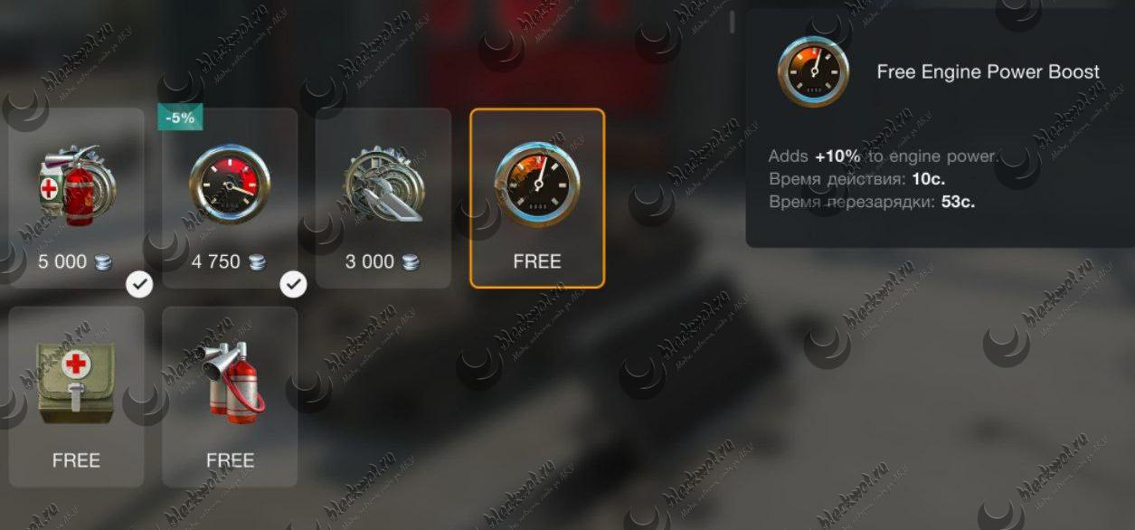 - Форсаж — длительность уменьшится на 3 сек, перезарядка уменьшится на 10 сек. Улучшенный форсаж — будет давать на 5% меньше к мощности двигателя, на 1 км/ч меньше к максимальной скорости вперед и на 2 км/ч назад. Перезарядка уменьшится на 25 сек.