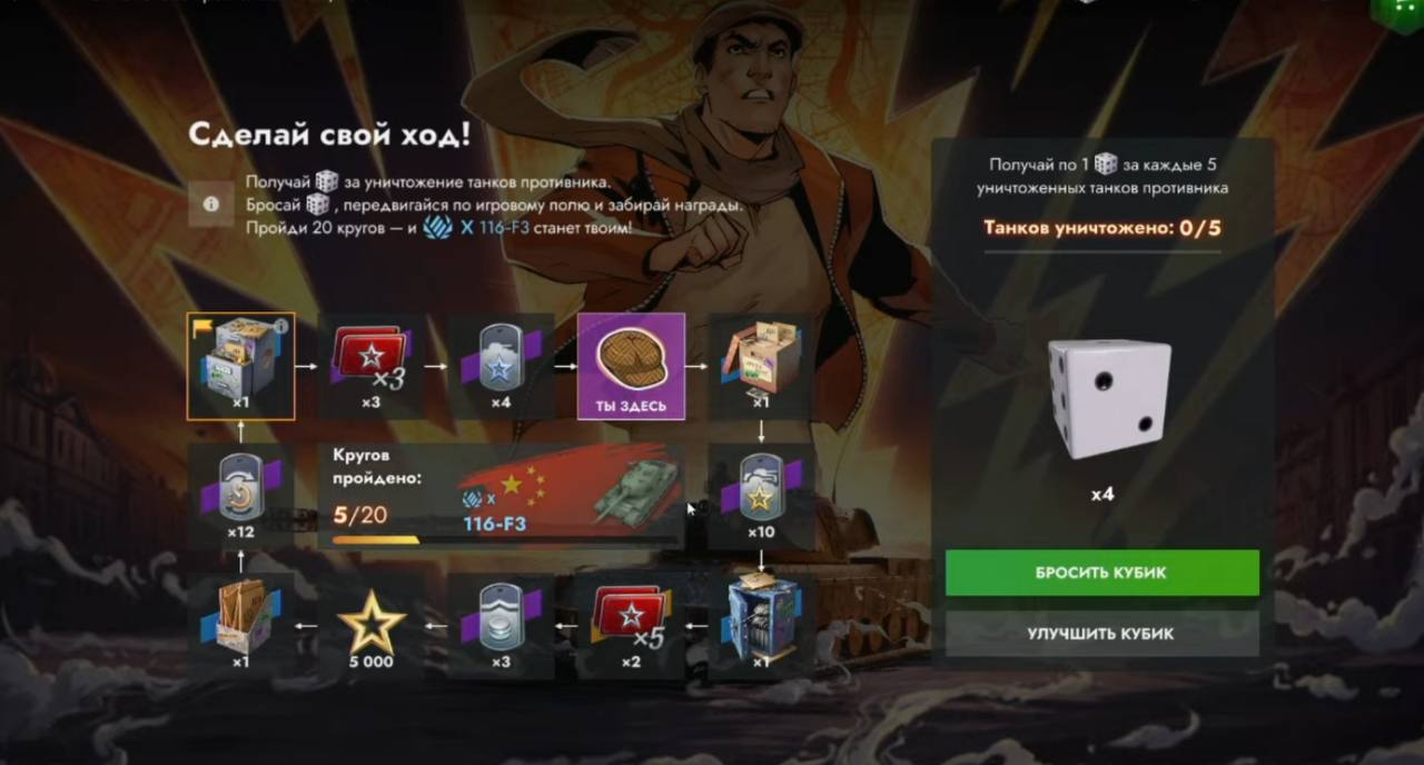 Можно получать кубики за уничтоженные танки. Бросив кубик, переходит по полям и забираем награды