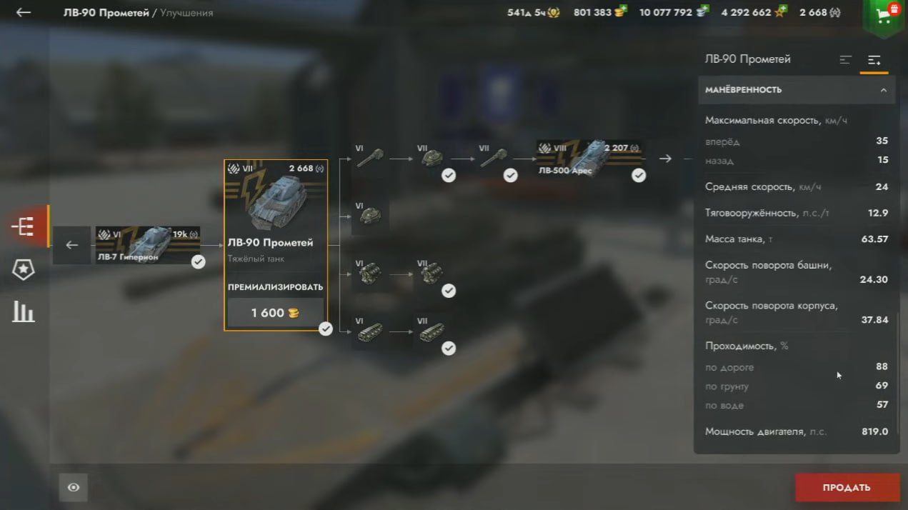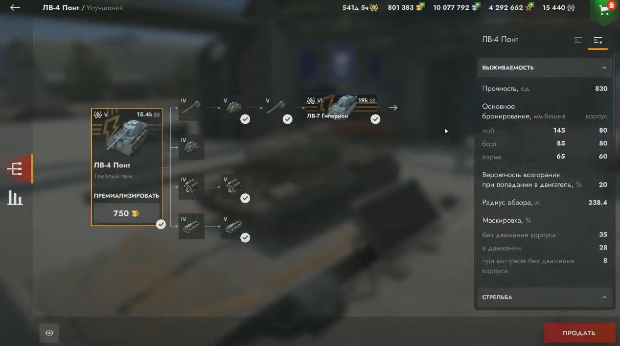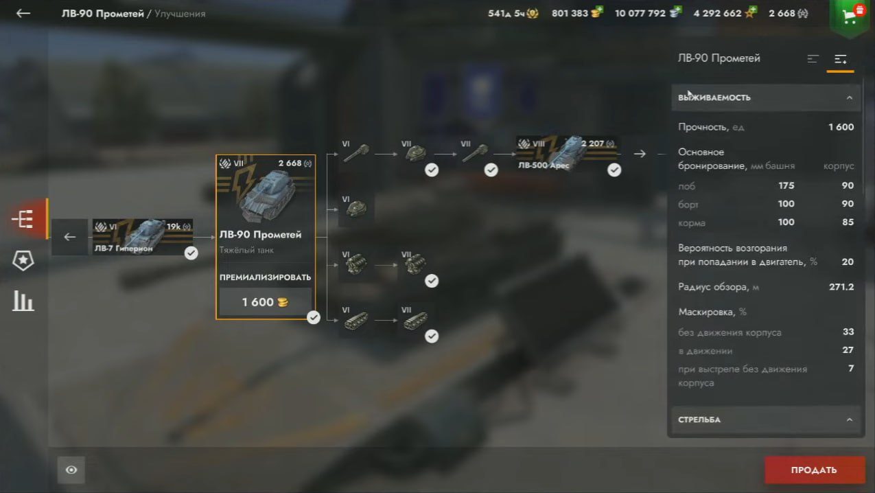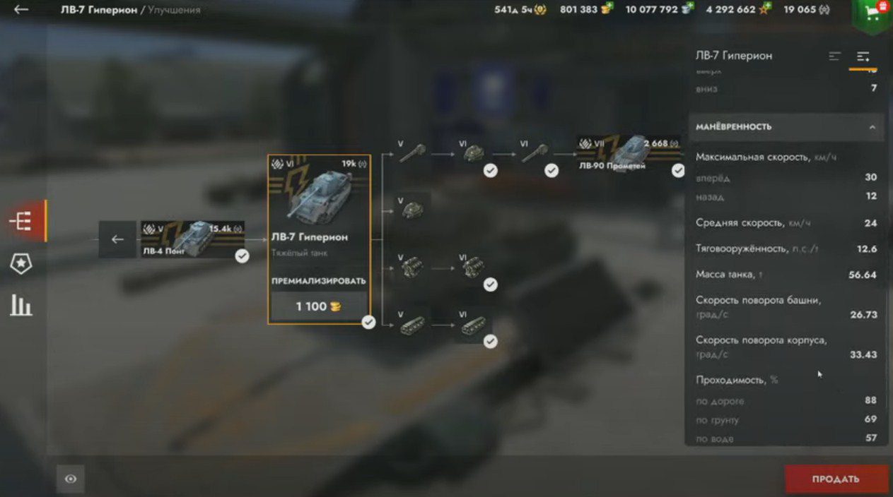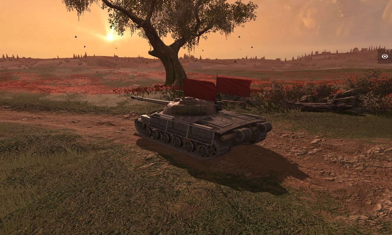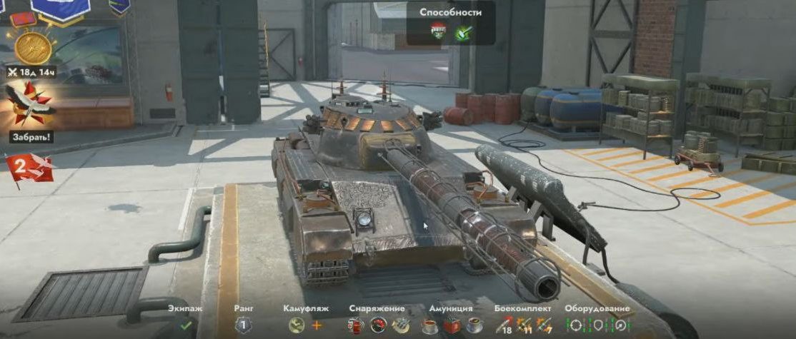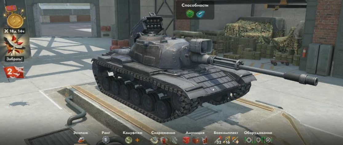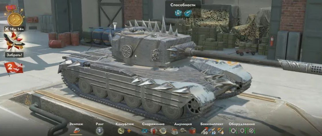Она обладает интересной механикой — Закрытие щитов. Доступно по кнопке в бою, перезарядка 7 секунд. Вы можете переключить расположение экранов с бортов на лоб. Если экраны сдвинуты вперёд, скорость и разгон танка уменьшены на 30%.