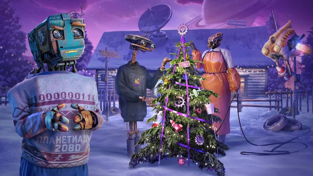 Славный дружище Робогозин, как старательно он наряжает новогоднюю красавицу-ёлку! Тут перевесит мишуру, там подправит ветку. Следит, чтобы украшения были со всех сторон!