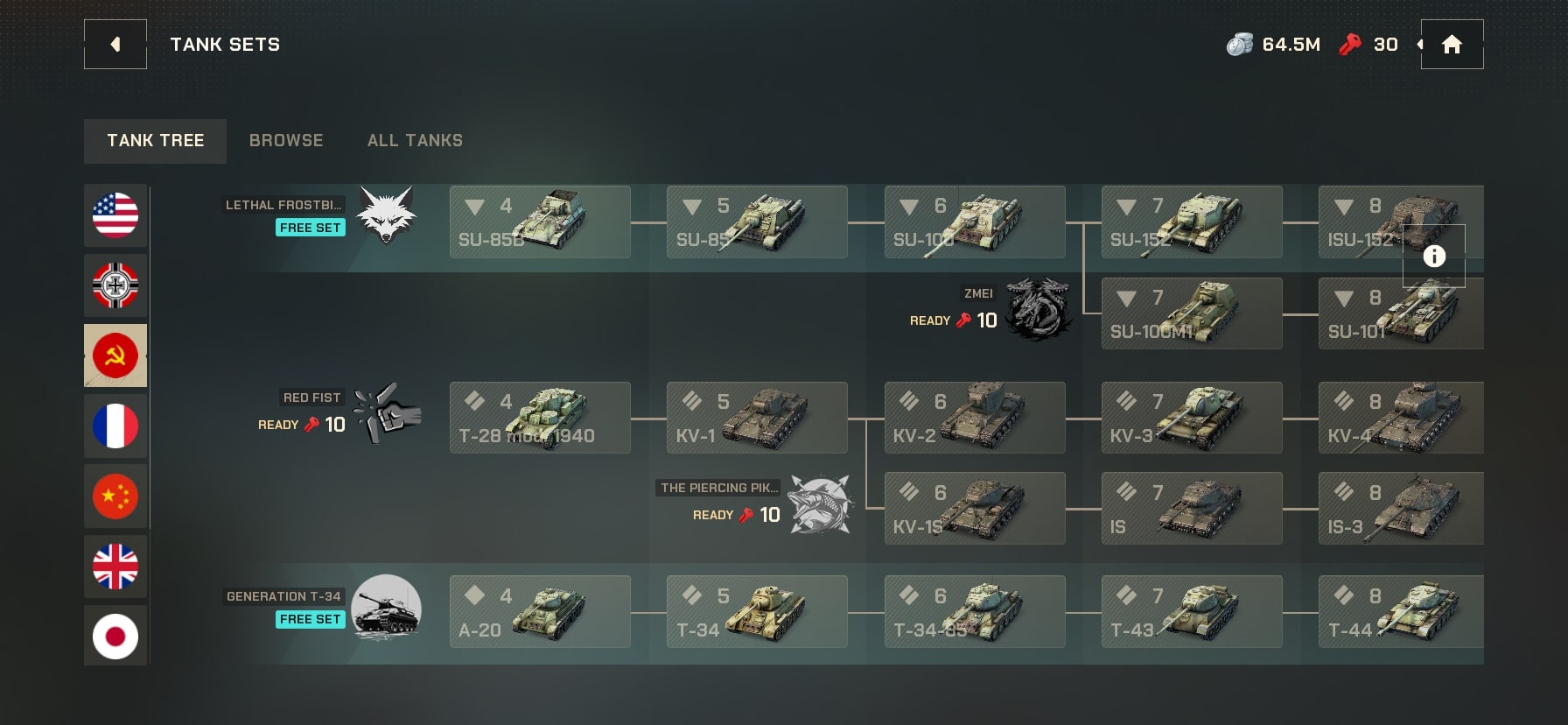 - Одиннадцать знаковых сетов доступны всем игрокам без необходимости разблокировать их за ключи. Это позволит с самого начала изучить больше наций и типов танков. Другие обычные сеты можно открыть за 10 ключей независимо от их размера или уровней танков.
