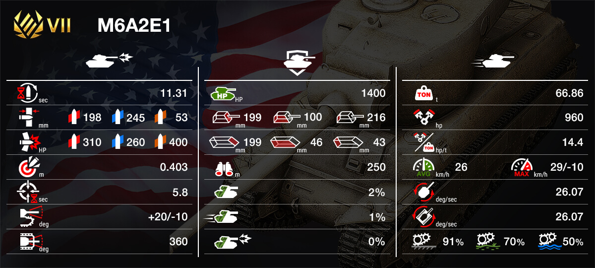 Жёлудей и в твоём Ангаре припаркуется харизматичный тяж VIIM6A2E1. Этот твердолобый здоровяк нетороплив, но попытка сбить его с выбранного пути дорого обойдётся любому противнику. Разрушительное орудие и крепкая лобовая броня M6A2E1 принесут тебе бесчисленные победы и горы кредитов!