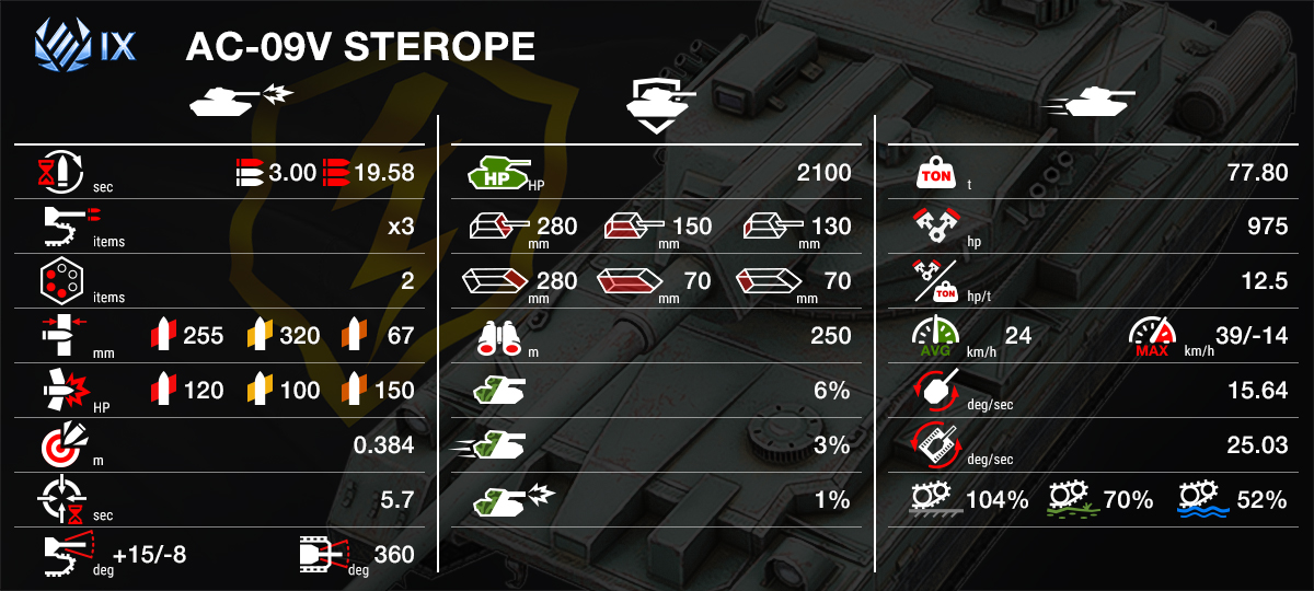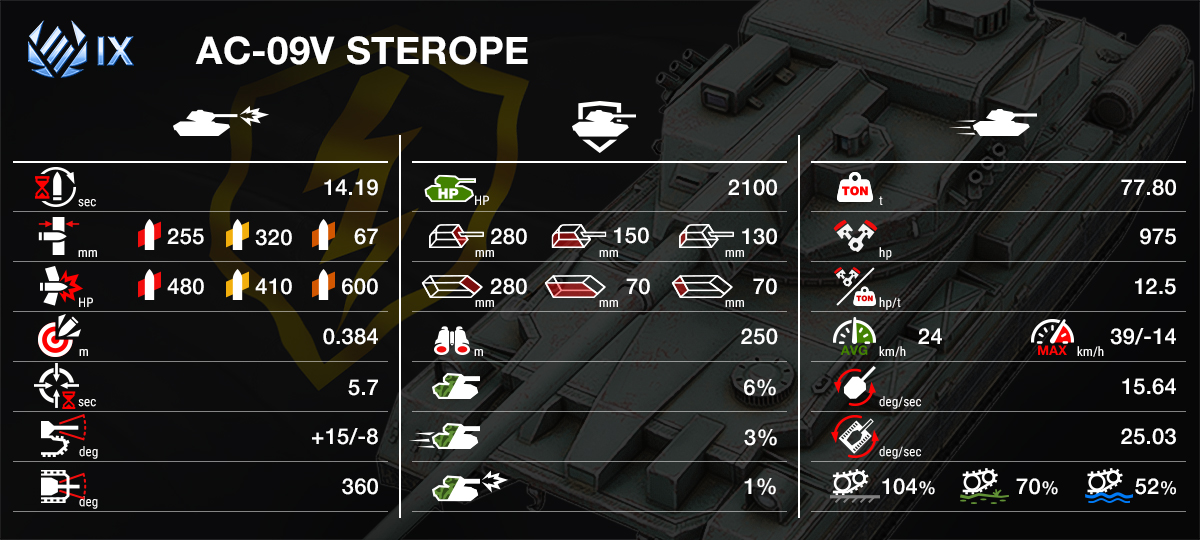 Защита у AC-09V Sterope тоже достойная: крепкая лобовая броня легко спасёт от ответного снаряда! Главное — держаться ближе к укрытию для перезарядки и не давать врагу выцелить корпус.