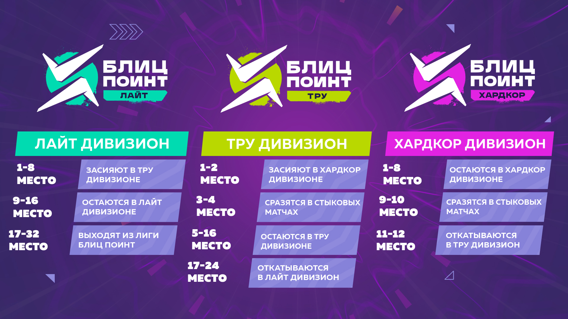 - Количество команд в Дивизионах уменьшилось: с 16 до 12 в Хардкоре, с 32 до 24 в Тру и с 64 до 32 в Лайте.