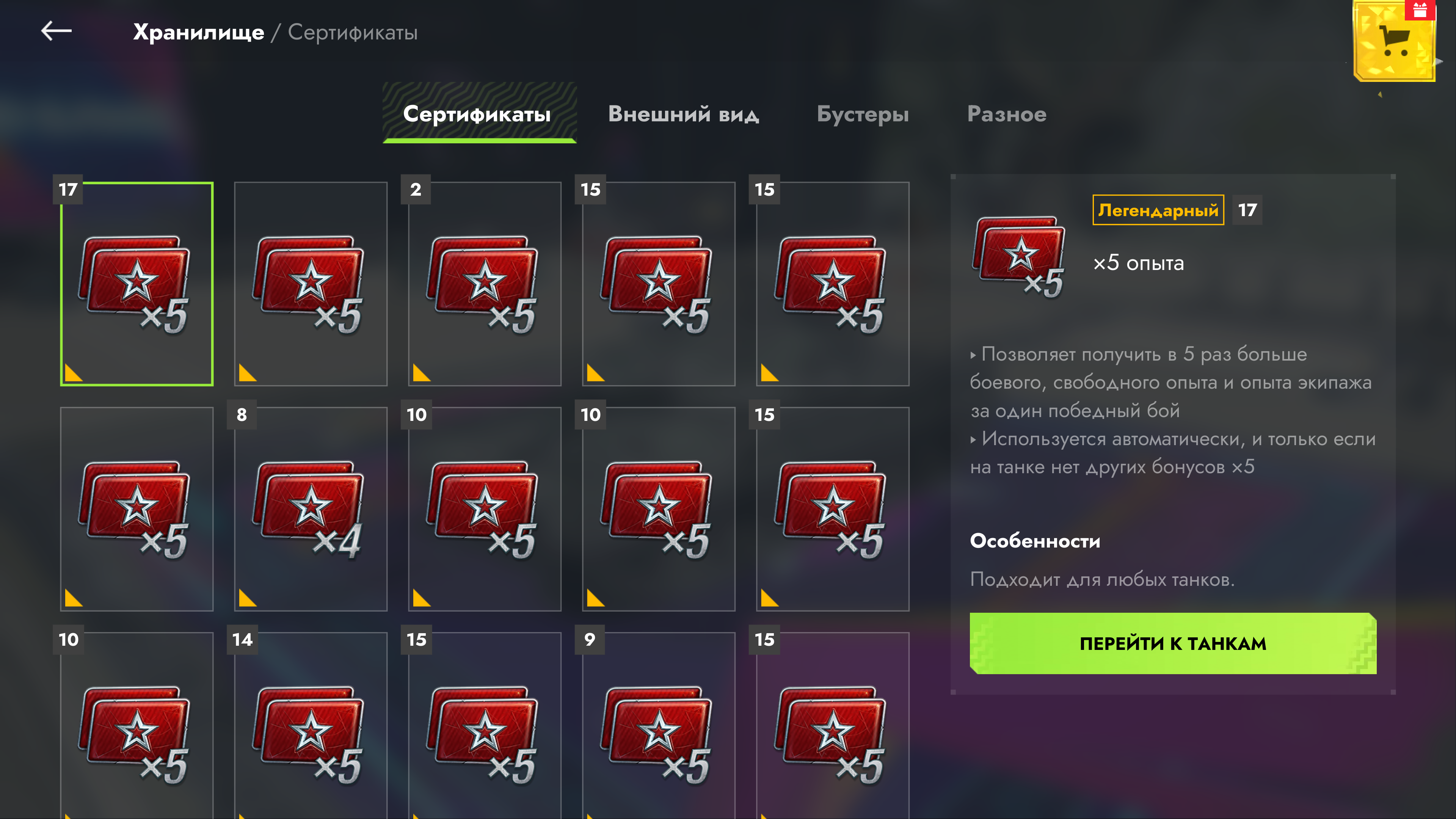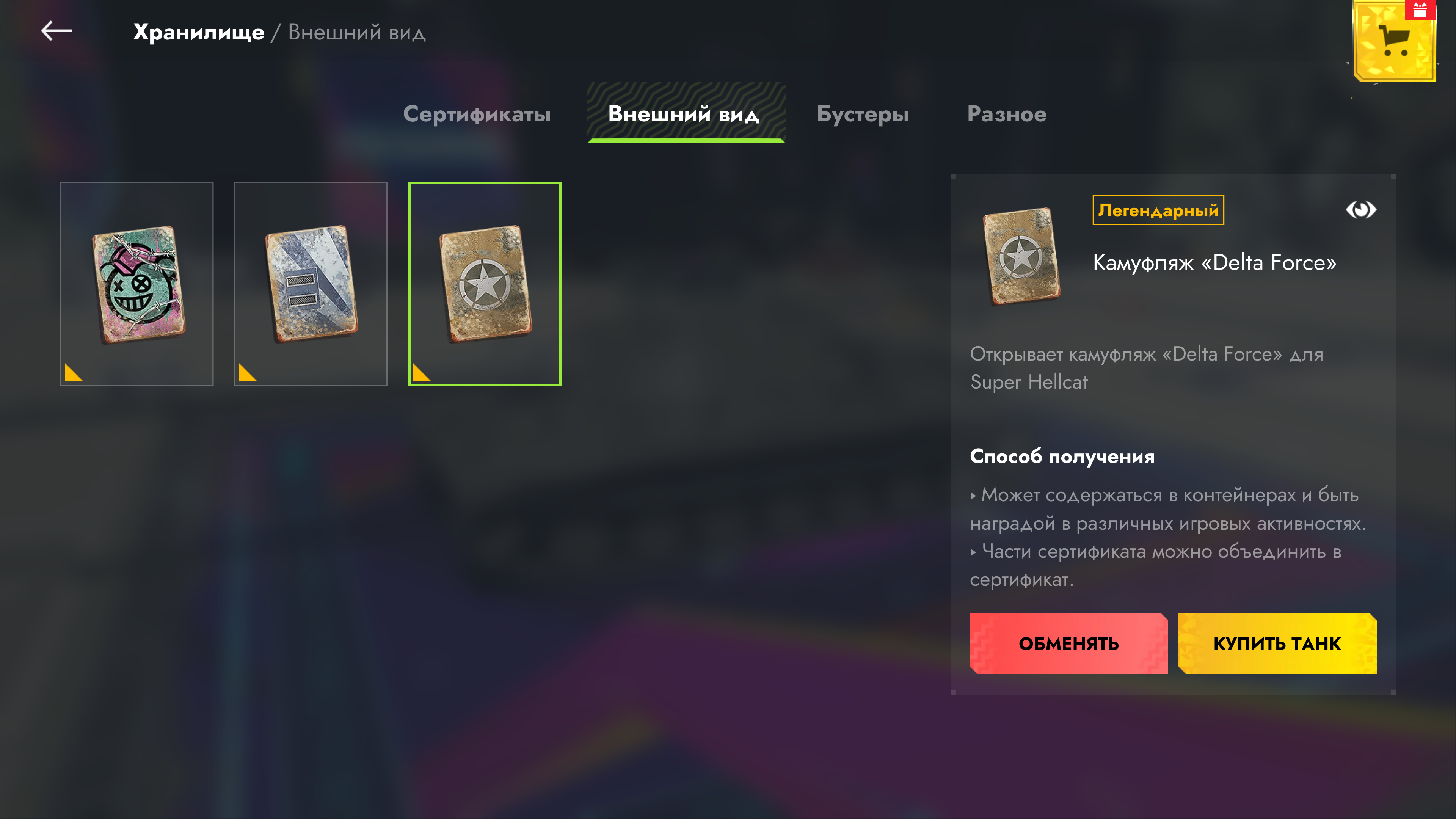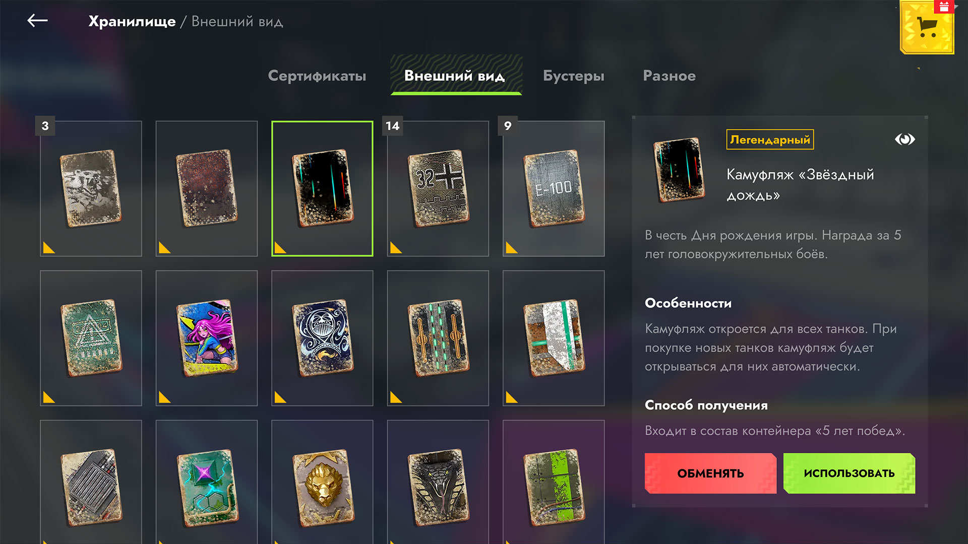 При наличии легендарного камуфляжа перейти к его установке или к покупке/восстановлению танка можно прямо из Хранилища.