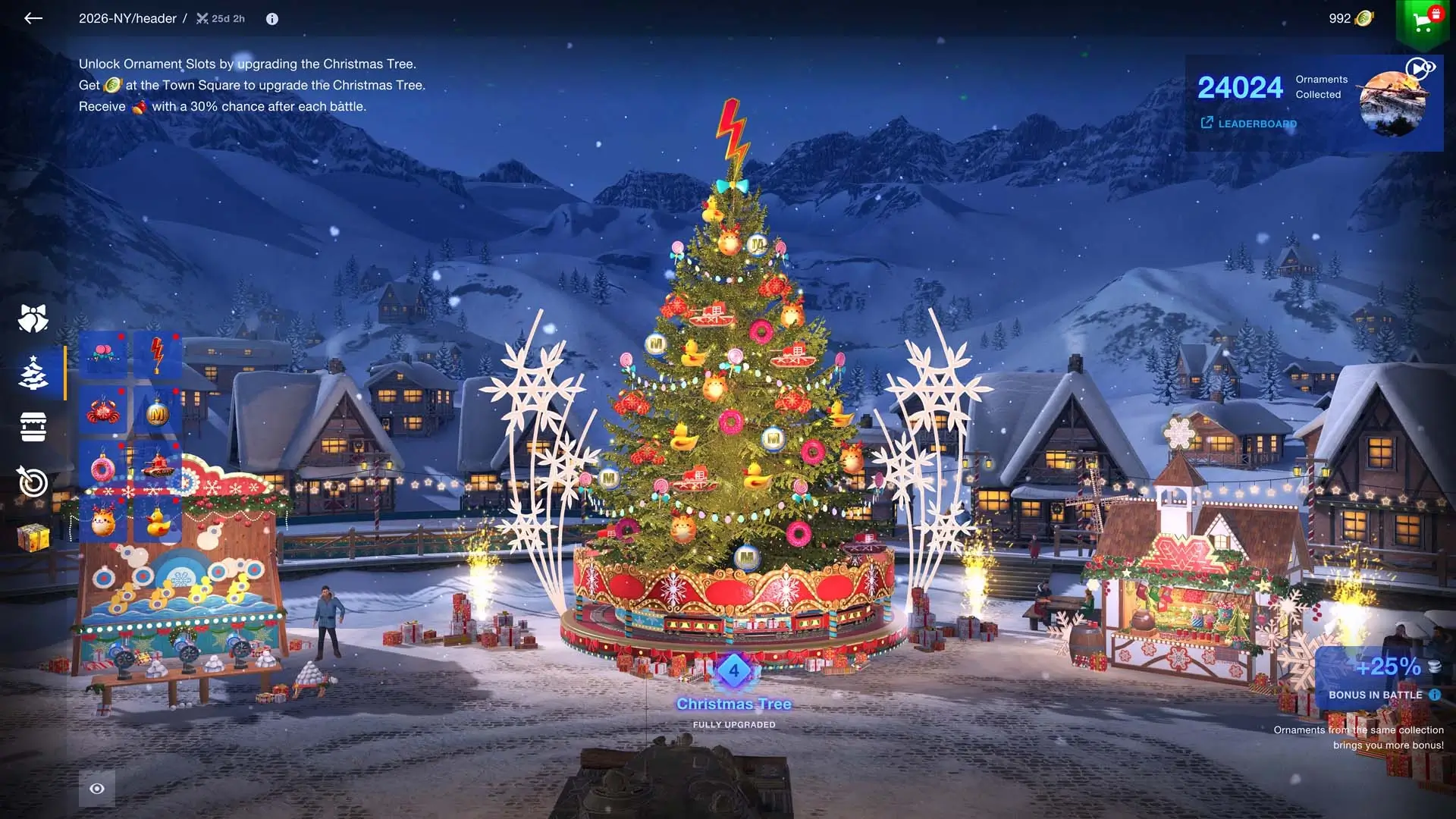 Украшенная ёлка даёт бонус до 25% к кредитам за каждый бой! Чем больше