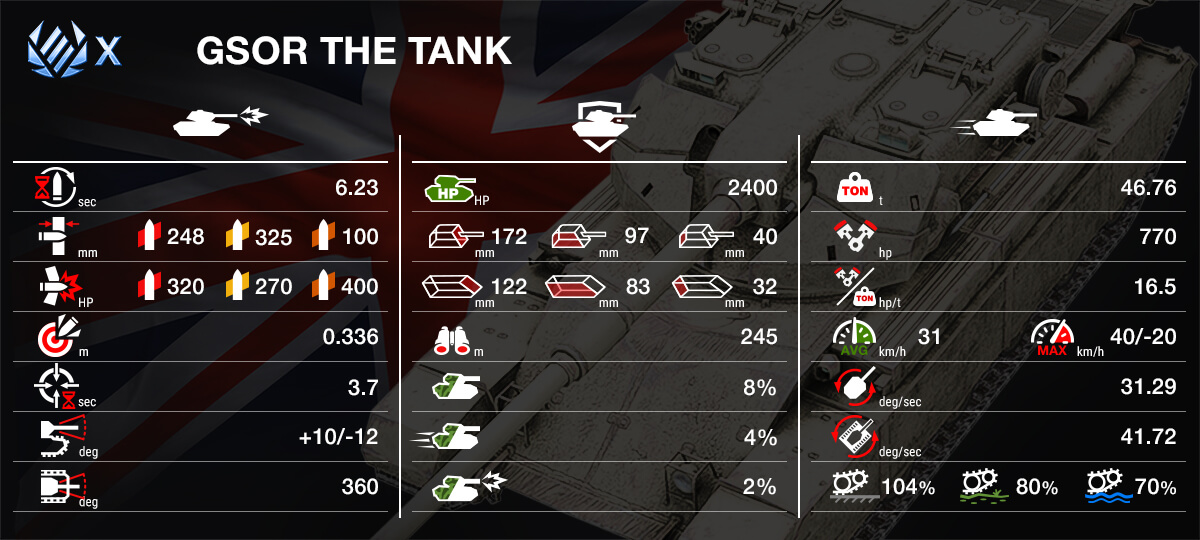 «Полутяж» GSOR the TANK уверенно чувствует себя и среди тяжёлых, и среди средних танков. Его сильные стороны — отличные УВН и высокий урон в минуту, один из лучших среди машин X уровня.