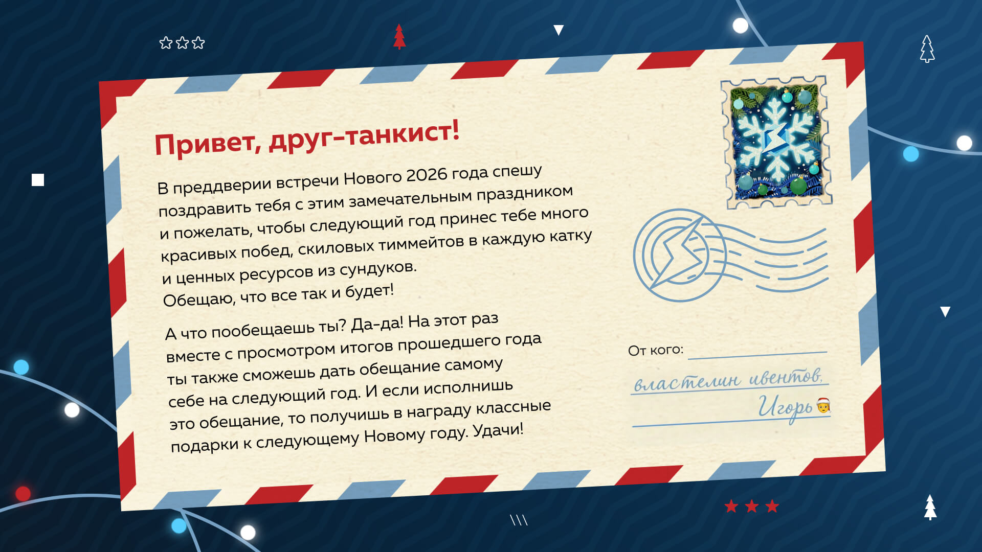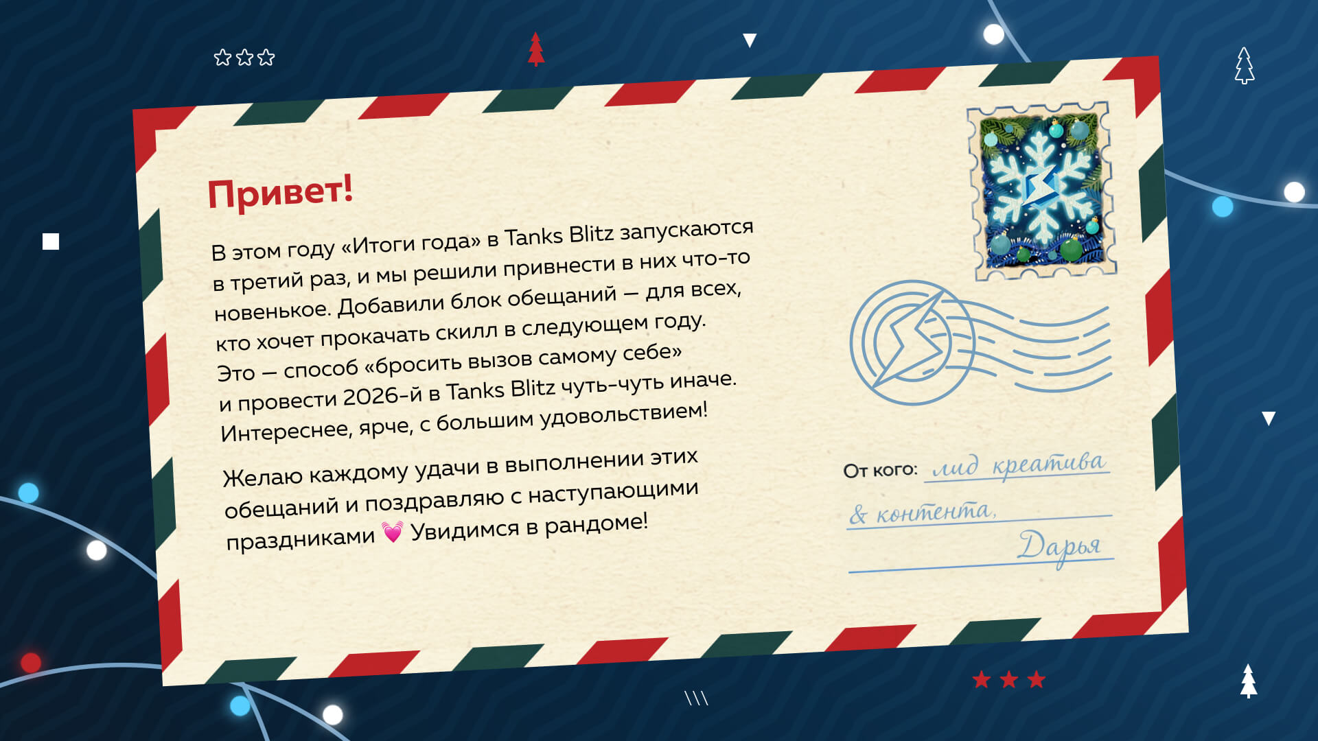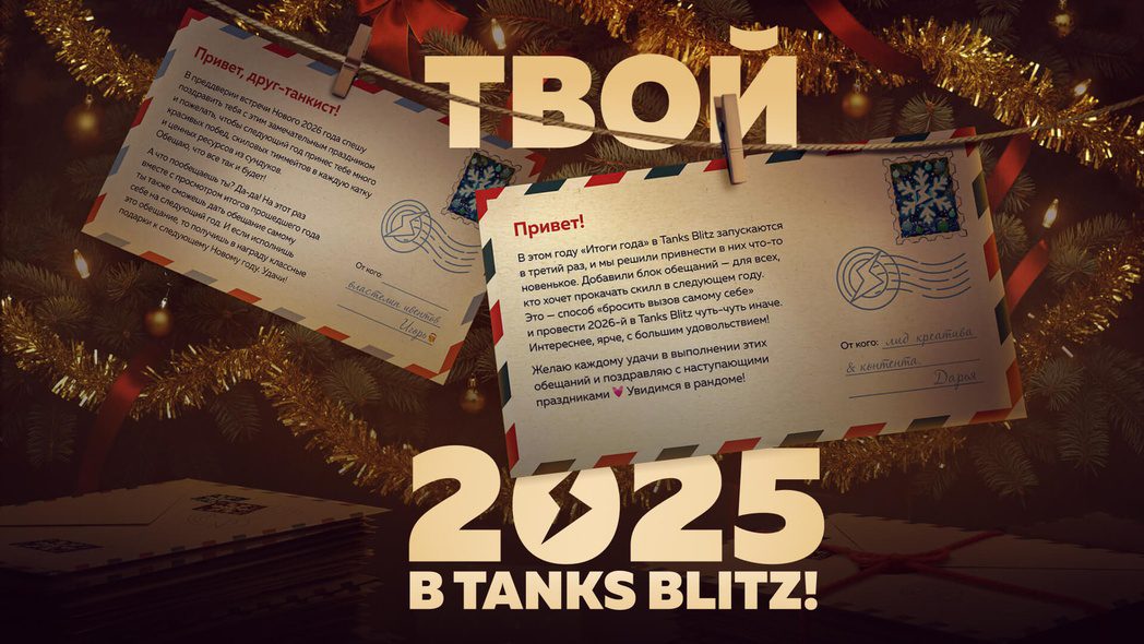 Чтобы узнать свои итоги и дать обещания, авторизуйся на сайте и зайди в раздел «Твой 2025». Не тяни — страница будет доступна с 25.12.2025 12:00 (МСК) по 13.01.2026 23:59 (МСК)! Делись своими достижениями и обещаниями в Tanks Blitz с друзьями с помощью уникальной ссылки. Пусть знают, с кем играют 😎