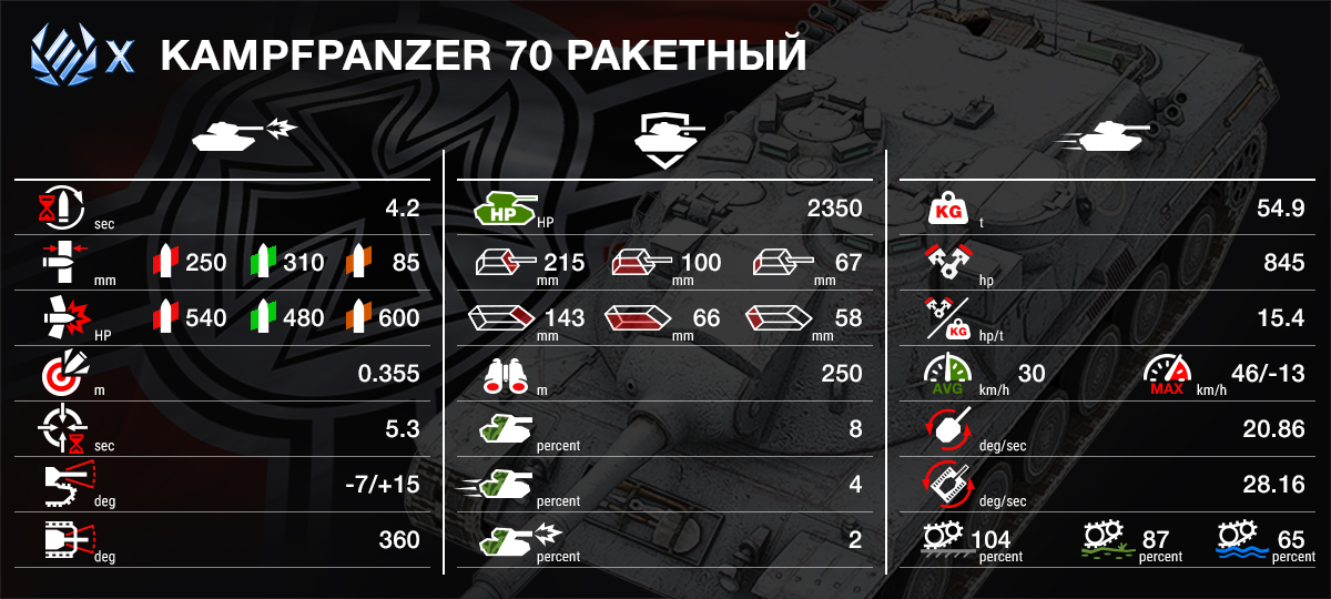 Надёжная машина с крепкой башней и низким силуэтом, которые позволяют уверенно танковать лбом и использовать укрытия. Обладает хорошей по меркам тяжей динамикой и мощным 152-мм орудием с долгой перезарядкой, но огромным разовым уроном. И, самое главное, в качестве одного из типов снарядов KpfPz 70 несёт ПТУР — противотанковые управляемые ракеты с впечатляющими уроном и пробитием. Добавь его в свою коллекцию и поставь ракетное вооружение себе на службу!