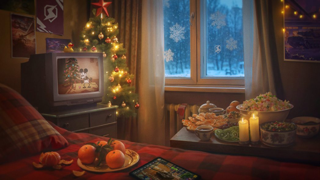 Вот бы не вставать с дивана, а продолжать лампово чилить, объедаясь мандаринами и кутаясь в тёплый плед, смотреть мультики по телику и радоваться снегу за окном… Не жизнь, а сказка! 🥰 Для полного счастья не хватает только залипнуть в Tanks Blitz.