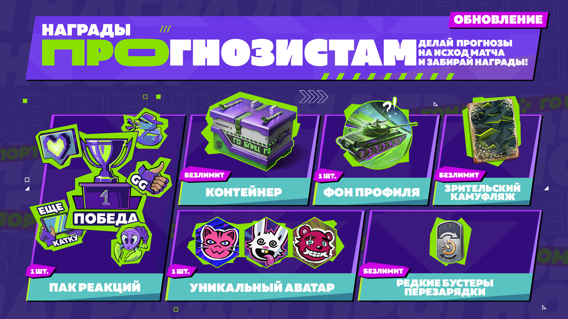 Псс, слышал о классном способе поднять наград? Нужно подрубить шестое чувство на максимум и зайти на страницу с прогнозами на игры Лиги Блиц Поинт. Сможешь предсказать, кто из игроков нанесёт наибольшее количество урона, сколько продлится финальный бой, какая команда станет новой Легендой и многое другое — получишь ценные призы. Чем больше точных предсказаний ты сделаешь, тем больше наград заработаешь!