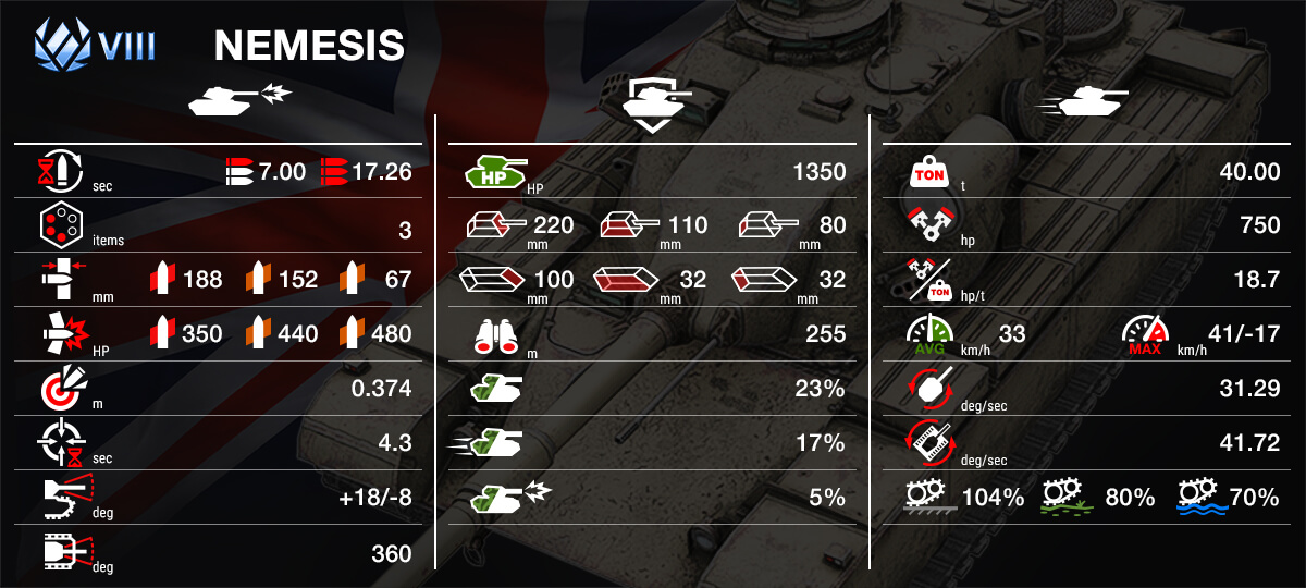 Коротко о VIII Nemesis: подвижный, отлично вооружённый и абсолютно неотвратимый! Мощный двигатель быстро срывает Nemesis с места, а «Улучшенный форсаж» позволяет проворно преследовать цель. А когда та настигнута, расплата следует стремительно — шквал урона от мощной пушки с магазином на 3 снаряда быстро и эффектно довершит разгром! Главное — позаботься о защите. Заходи с флангов, прячь уязывимые части корпуса и наслаждайся бессильной яростью противников!
