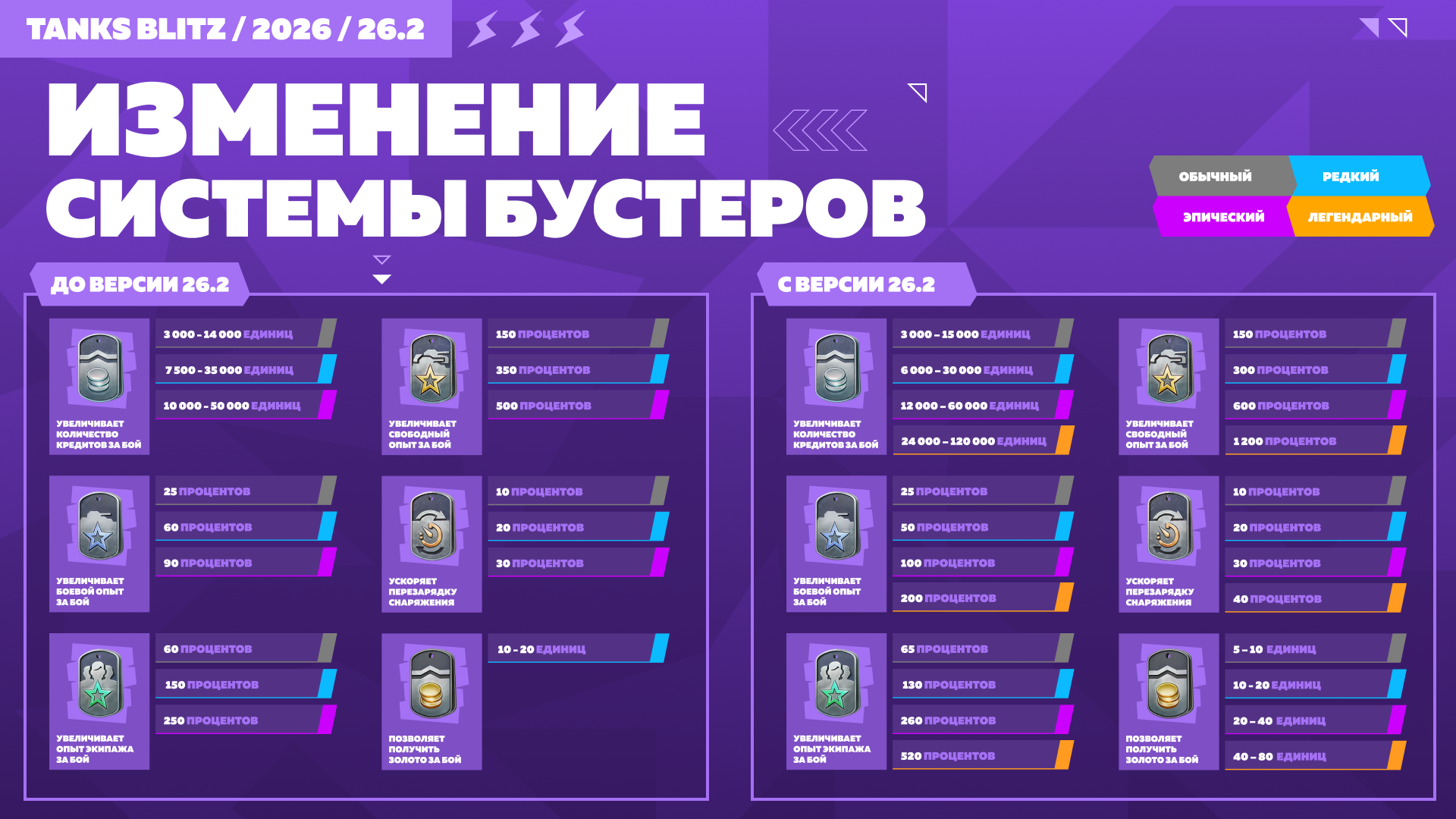 бустеров появился Легендарный грейд! А ещё теперь каждые три бустера можно объединять в один бустер следующего грейда. Но самое крутое то, что и у бустеров золота теперь есть все четыре грейда. Только представь: с Легендарным бустером голды ты получишь как минимум 40 за каждый бой!