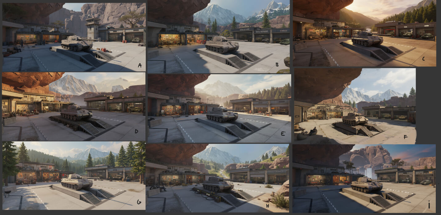 Перед тем как окончательно определиться с финальной концепцией Ангара в обновлении Reforged, мы изучили разные варианты его устройства: и под открытым небом, и под крышей. В зависимости от этого создавалось разное настроение.