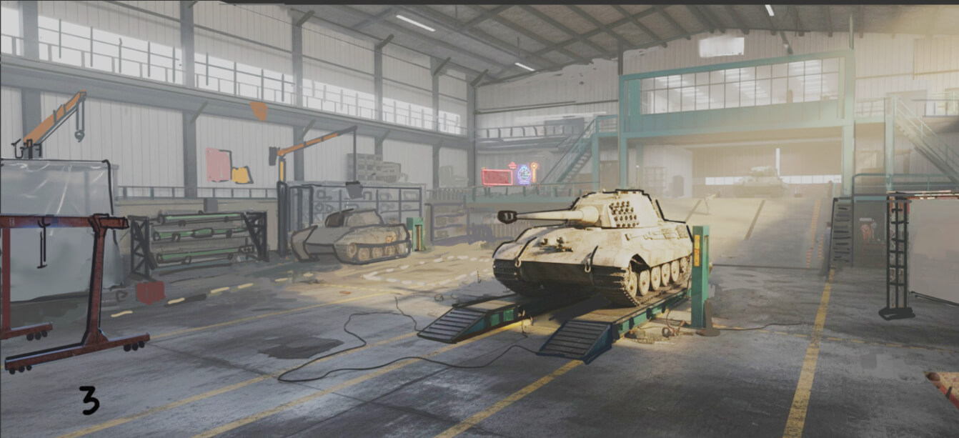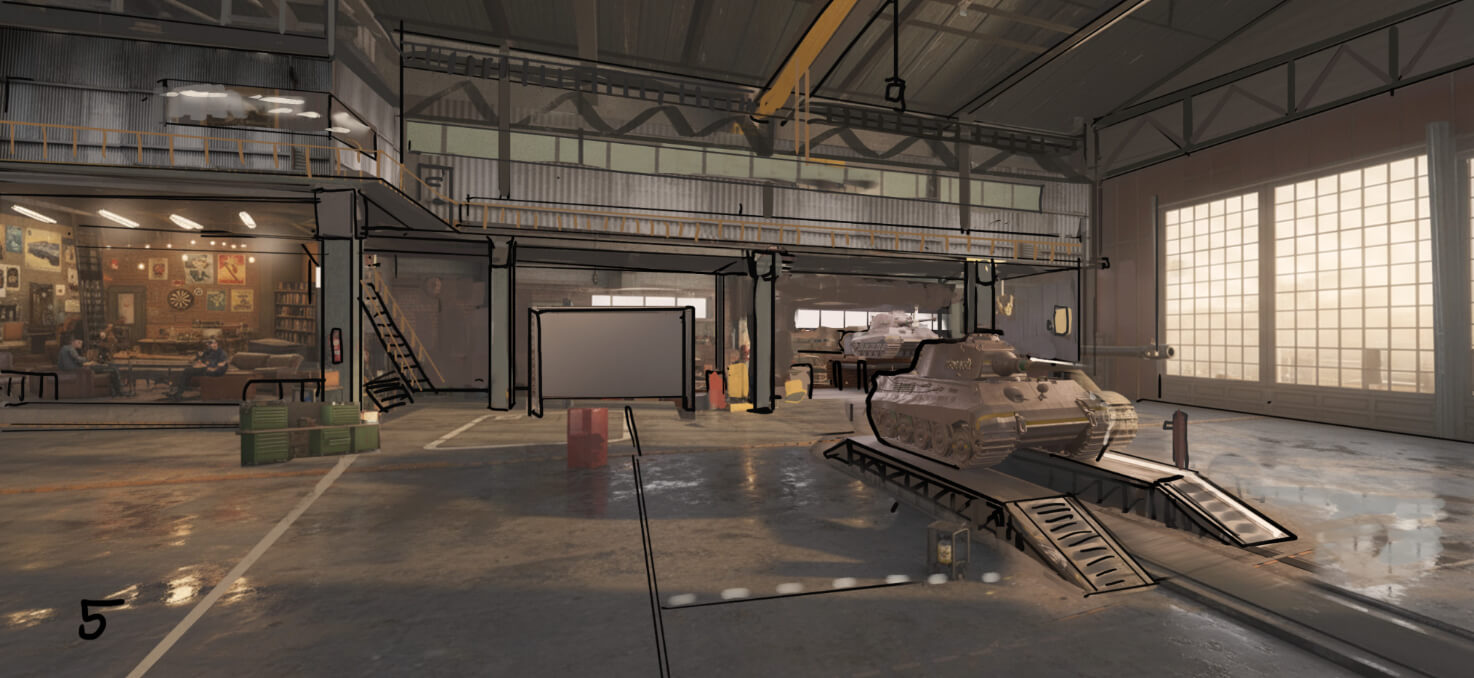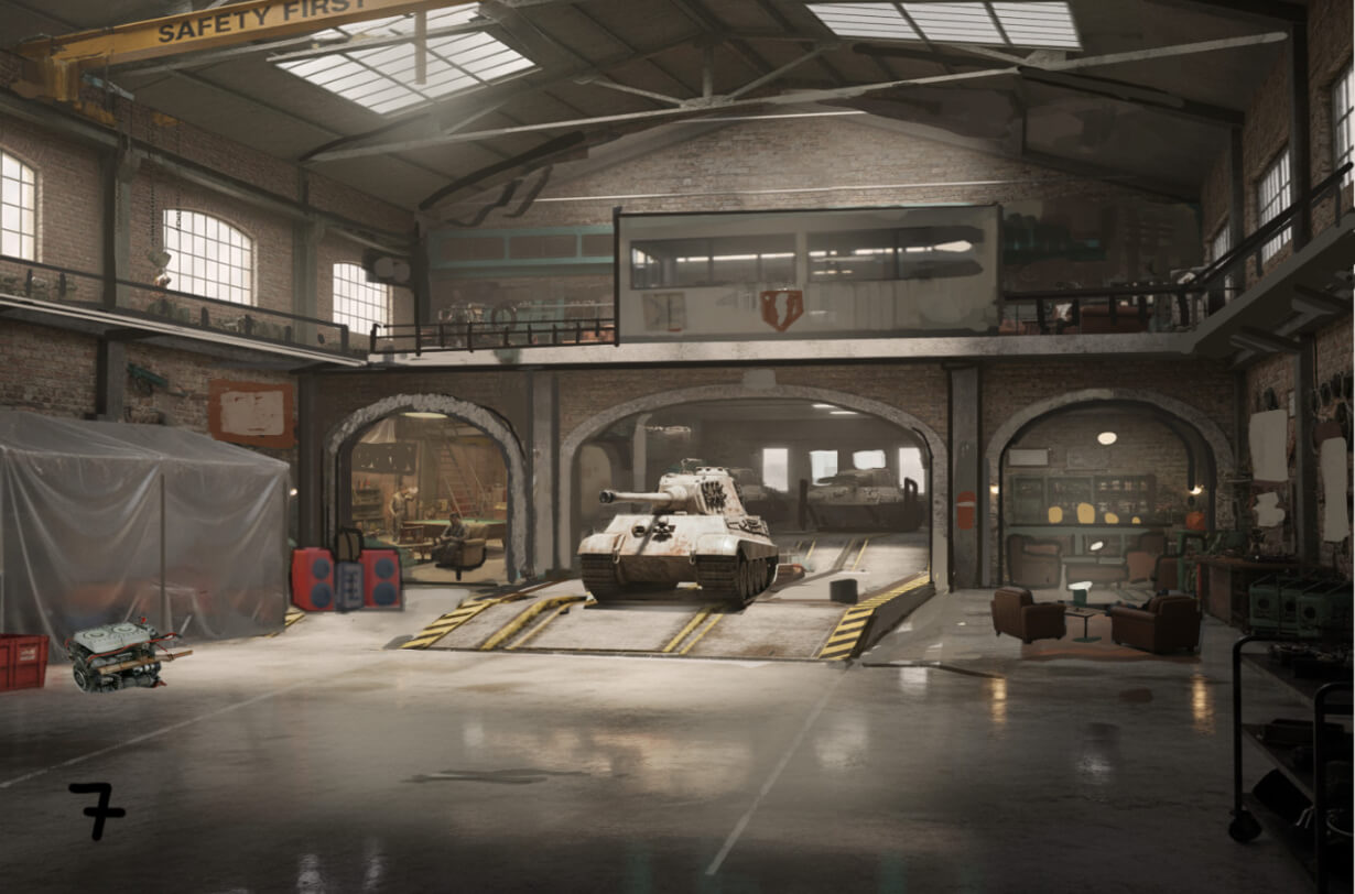 Для реалистичности Ангара мы его немного «исцарапали», добавили потёртости, а кое-где на стенах и предметах оставили ржавчину. В то же время мы потрудились над тем, чтобы сохранить в нём тот самый дух Blitz, который мы все любим.