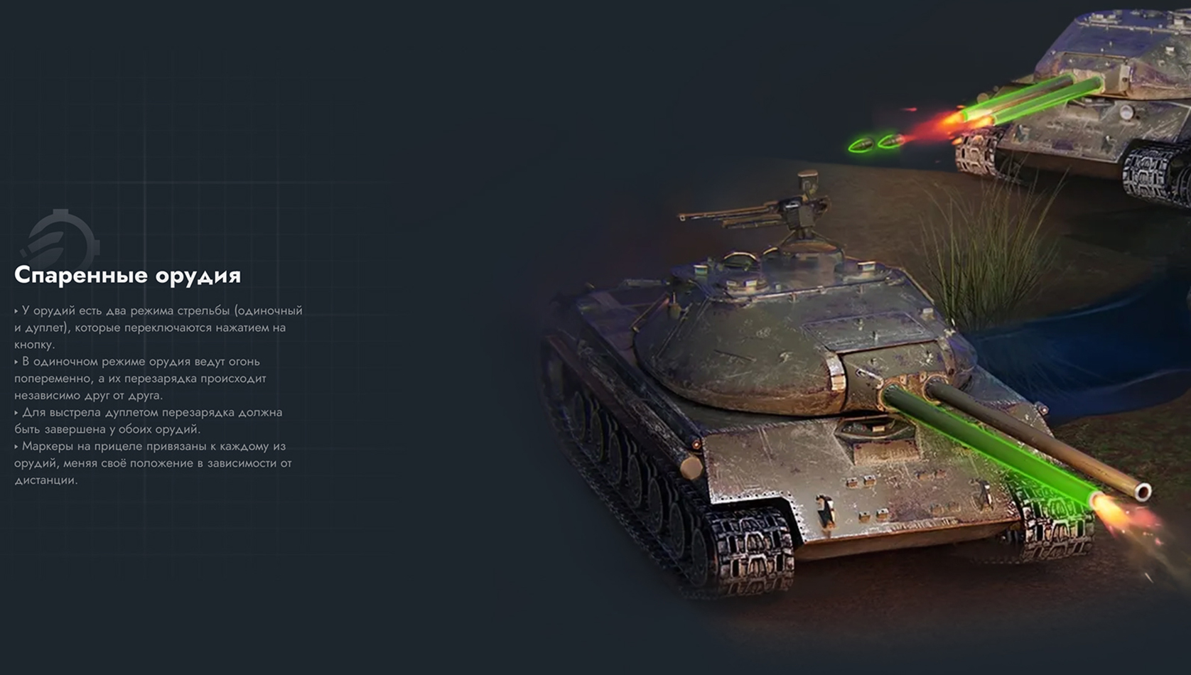 Один — хорошо, а два — лучше! С новой механикой «Спаренные орудия» играть станет в разы интереснее, ведь теперь у тебя будет два способа уничтожения врагов. Стреляй из пушек поочерёдно и изматывай противников постоянным огнём или бей мощным залпом и моментально отправляй их любоваться горами в Ангар. Освой искусство стрельбы со спаренными орудиям — и устрой настоящий разнос!