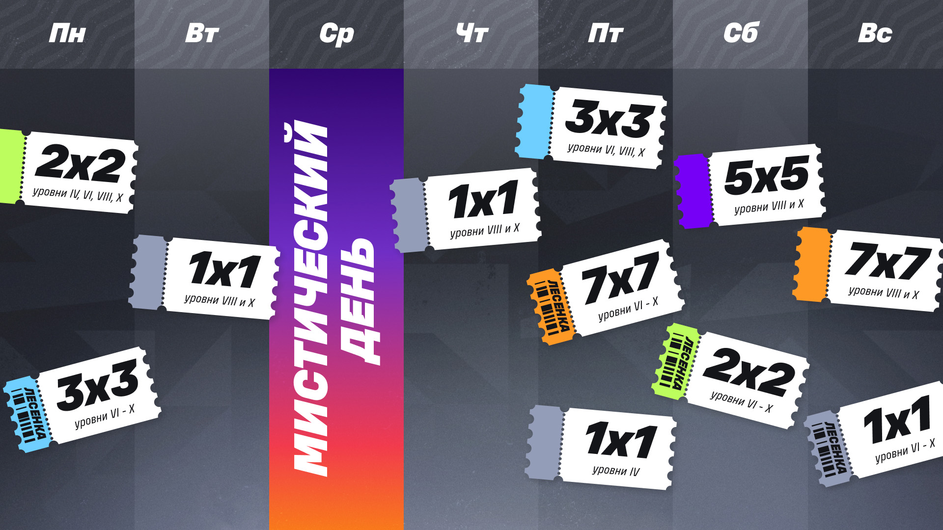 Будь на чеку в «Мистический день», сражайся в обновлённых турнирах и зарабатывай множество ценных наград! И помни: «Мистический день» случается только раз в неделю 😉