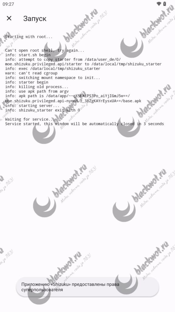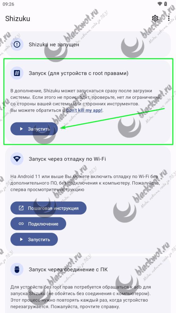 - Способ запуска Shizuku с помощью ROOT — способ для тех, у кого есть права суперпользователя (ROOT / SU) на устройстве.