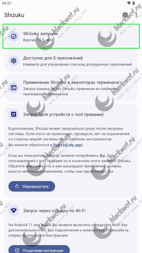 Если всё было выполнено правильно — в приложении сверху видим надпись «Shizuku запущен» .